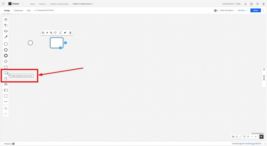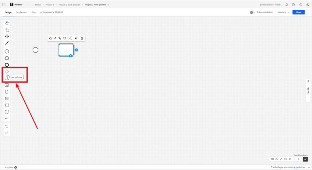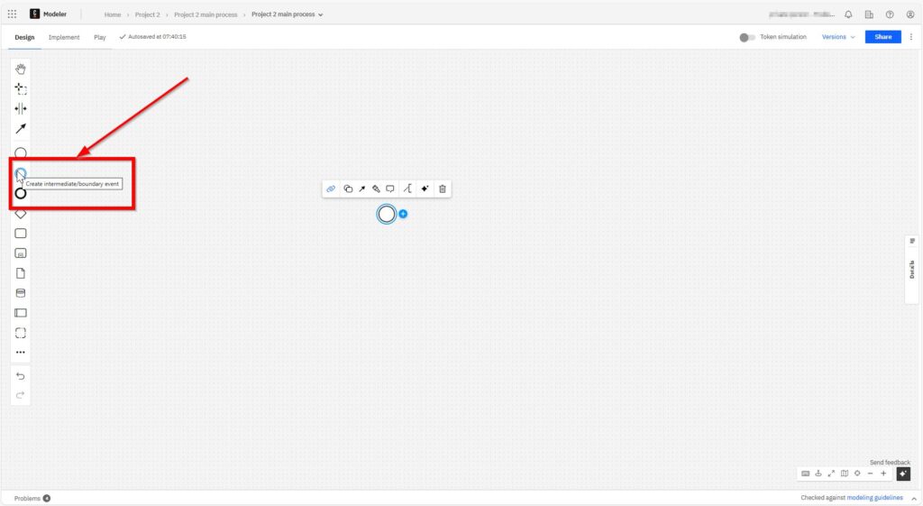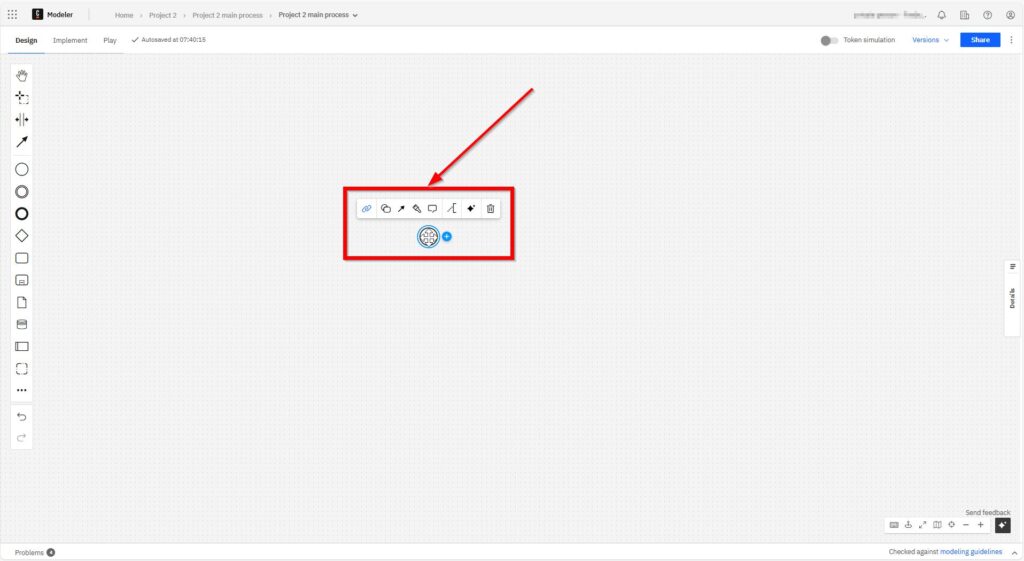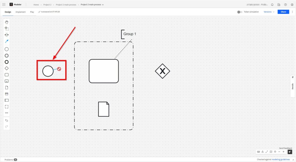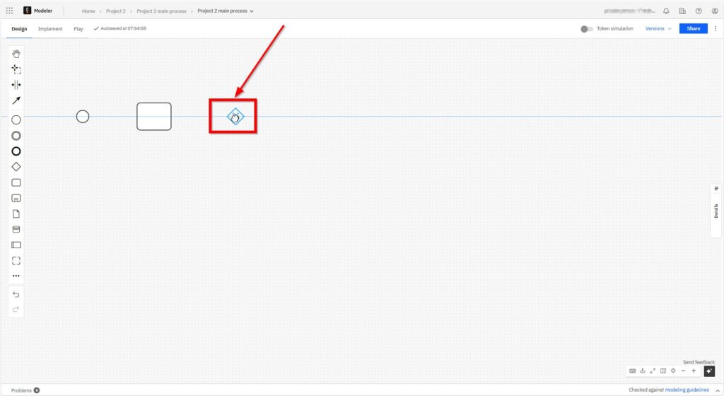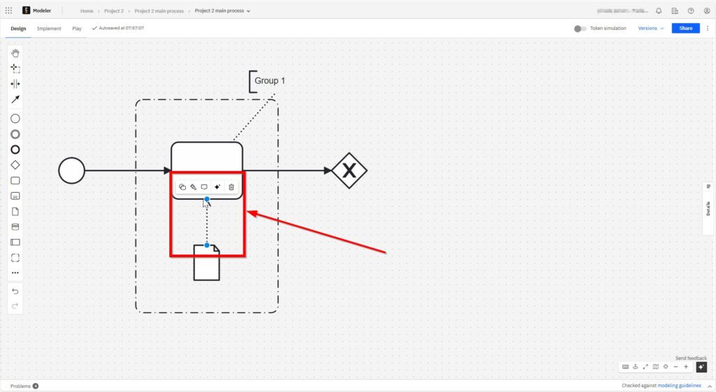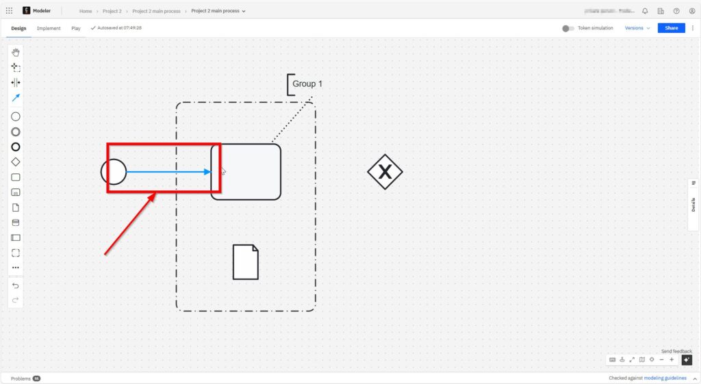 I use sequence flows to show the order of activities. Each arrow leads from one element to the next. It’s the glue that holds everything together. Without sequence flows, the diagram would make no sense. I click on the start element and can now loosely select the element to be connected.