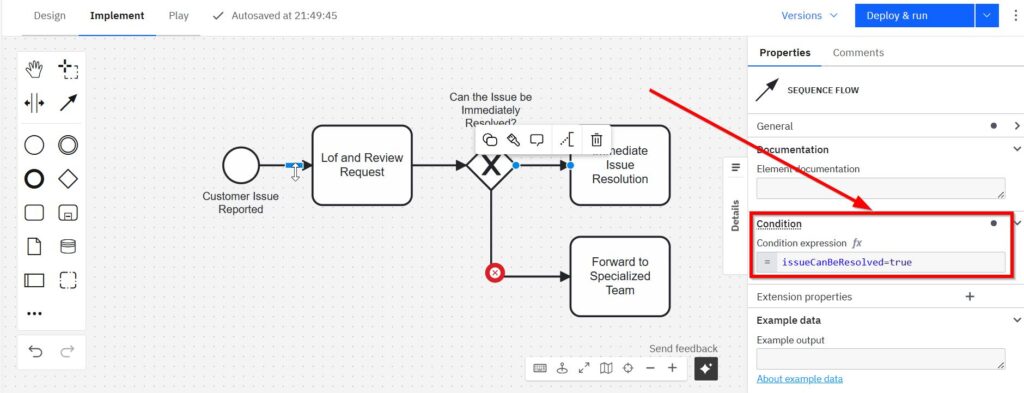 The BPMN modeling of exclusive gateways in Camunda requires the handling of condition expressions. Clicking the red circled “x” at the top opens the Properties pane. I enter the FEEL expression “issueCanBeREsolved=true” into the “condition expression” field.