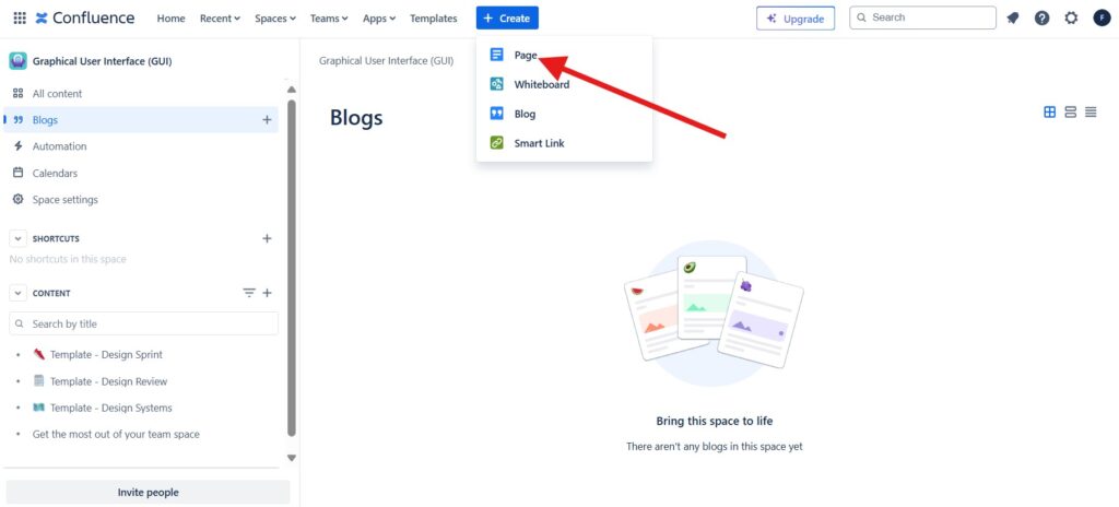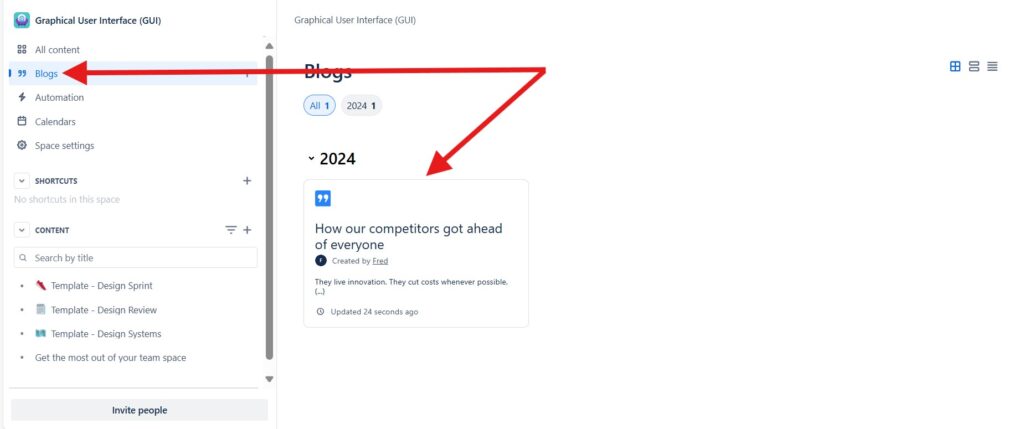 Log in to Confluence. Go to the space where you want to publish your blog post. Navigate to the “Blog” section.