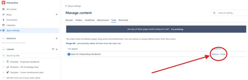 If you have space permissions that allow for it, the deleted page will move to the trash rather than being permanently deleted right away. You can access the trash by going to the space settings and selecting “Trash” from the sidebar.