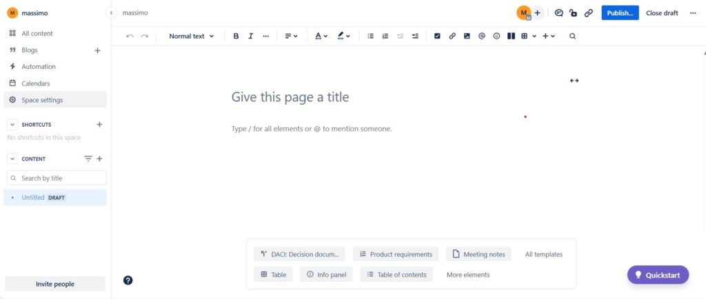 First and foremost, I set up Spaces. Spaces act as the overarching structure within Confluence, and I create separate spaces for each team, project, or major initiative. This keeps everything organized and ensures that related content is grouped together. For instance, our marketing team has its own space, while each client project has a dedicated space.