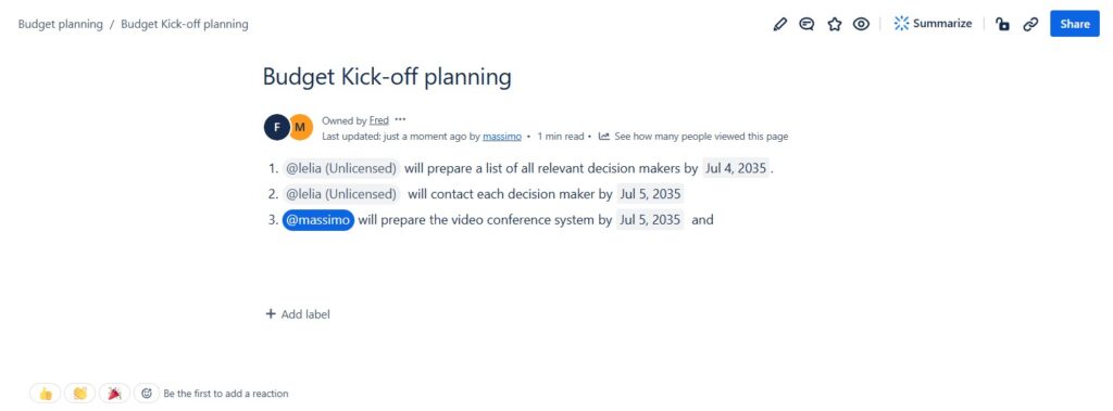 For example, when we kick off a new project, I create a project plan in Confluence and link all related Jira issues. This way, anyone viewing the project plan can see the current status of tasks, assigned team members, and any related comments or updates.