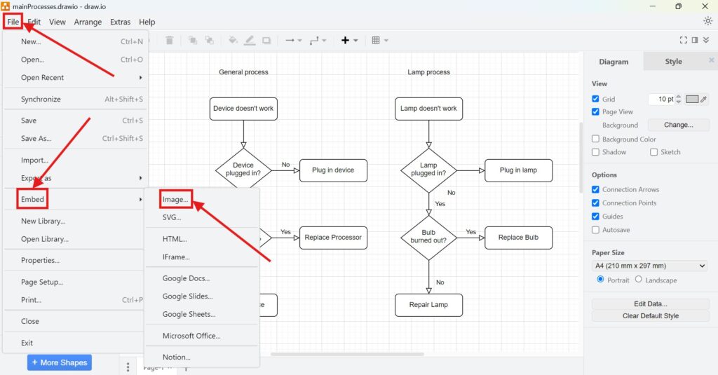 - Click on File > Embed. From here, select “Image” to export your diagram.