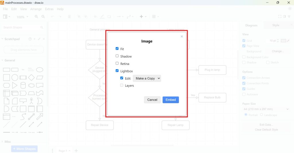 Pick the configuration that suits your needs. For instance, if you want the diagram to be interactive, go for “Lightbox.” Once you’ve made your selection, click “Embed.”