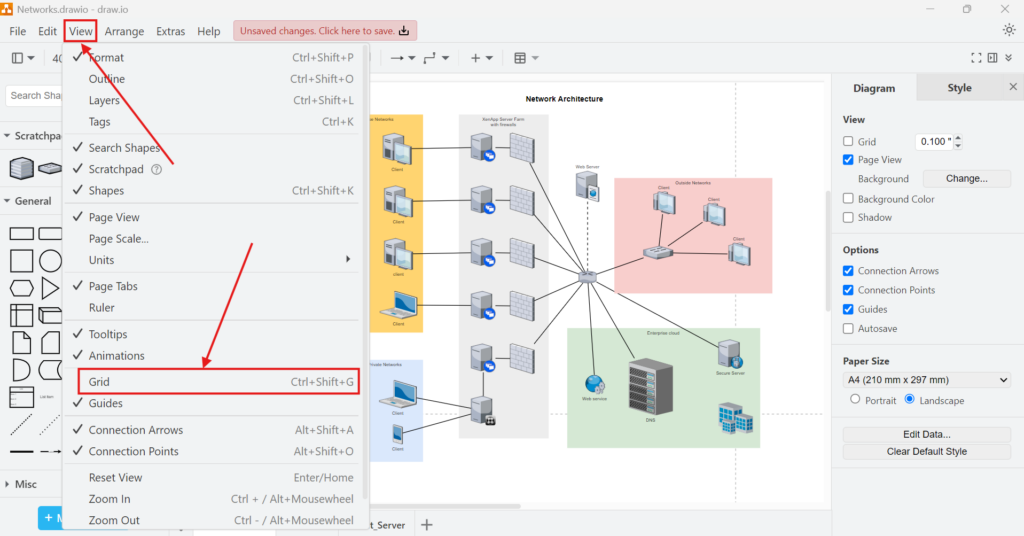 Activating the Grid View in draw.io