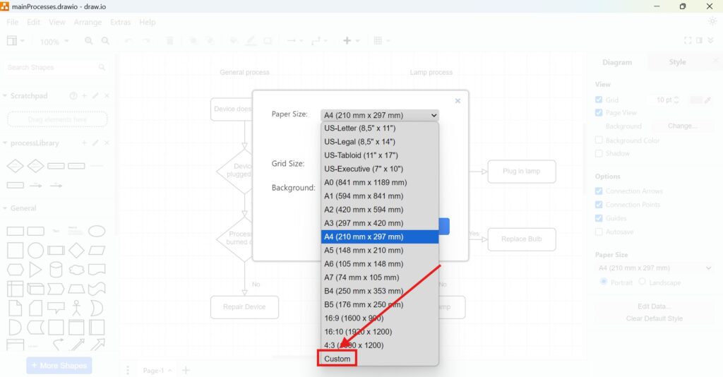 Paper Size Options in Draw.io
