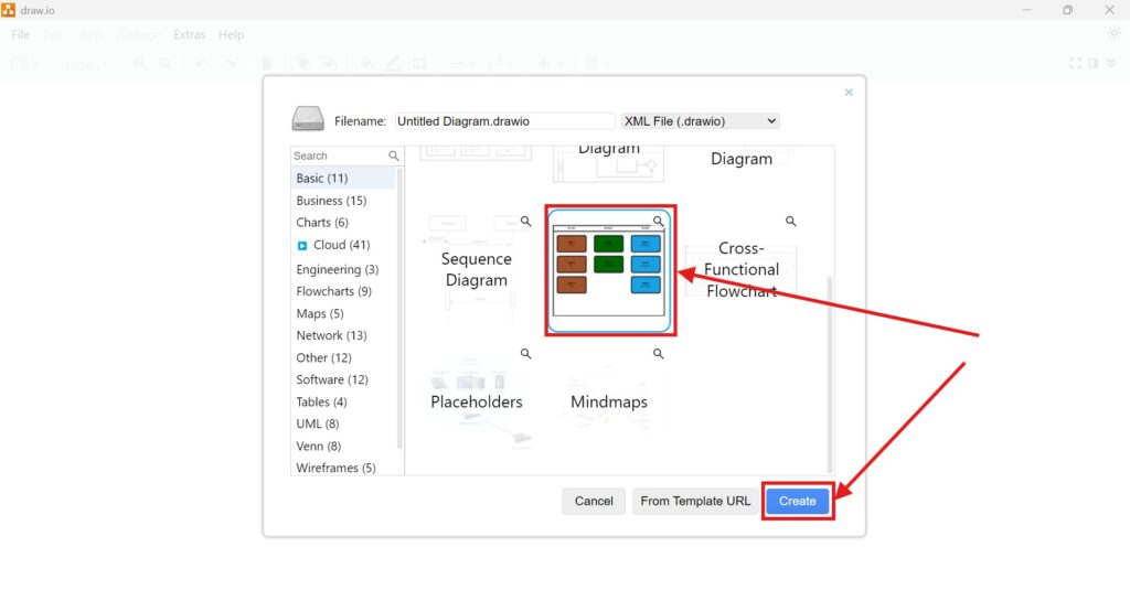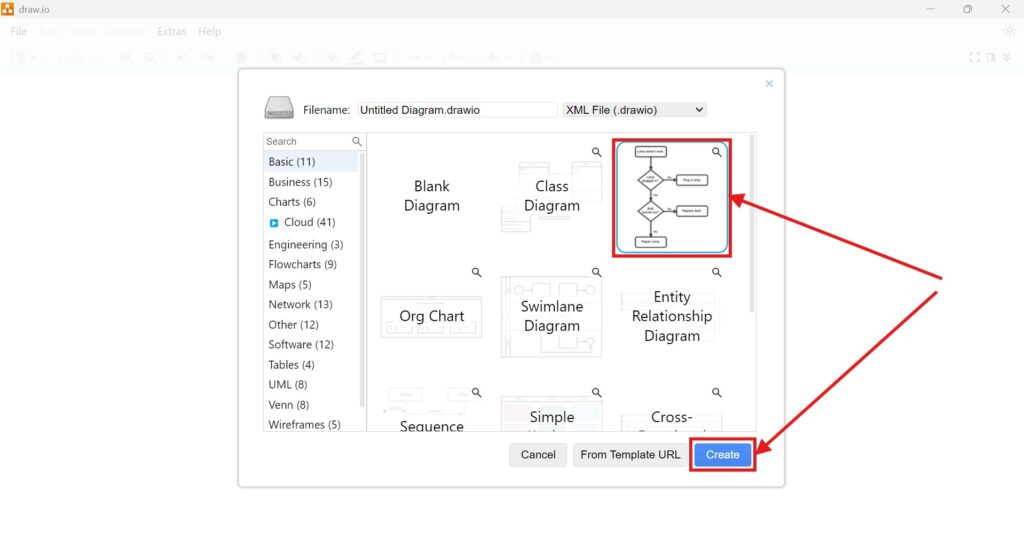 3. Step: Select a Template: You’ll be presented with a gallery of templates. For example, let’s say you’re working on a flowchart. Select the “Flowchart” template and click “Create” at the bottom left.