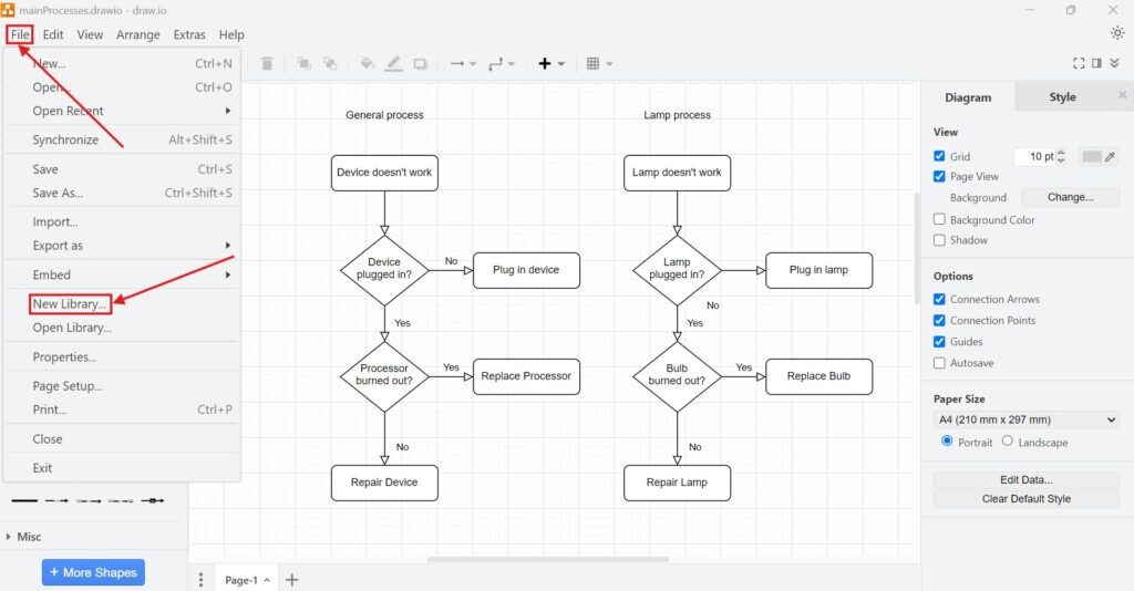 1. Step: Navigate to “New Library” Open Draw.io and go to the menu. Click on “File” and select “New Library.” It’s that simple.