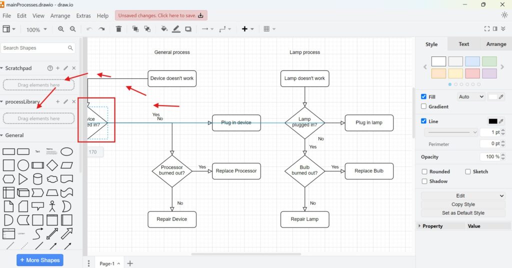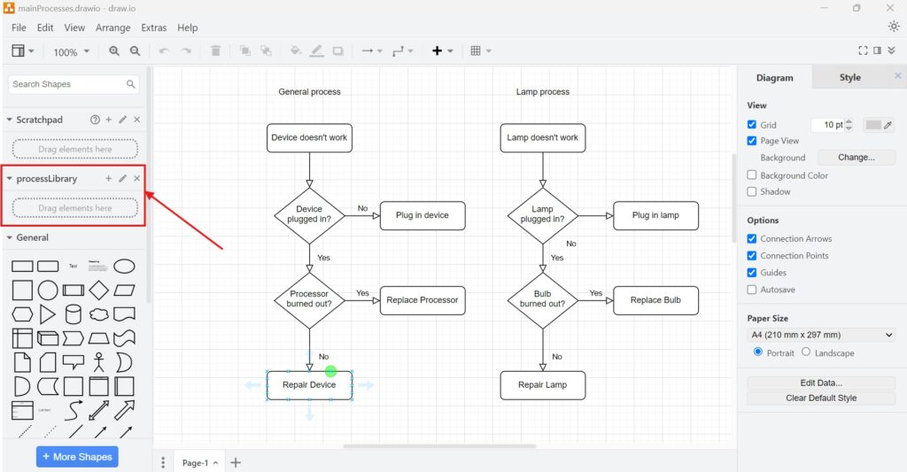 4. Step: Add Elements to Your Library Start building your library by dragging elements from your diagram into the library panel. Initially, it may look like your diagram got messy. Don’t worry. Once you drop the elements, everything reorganizes automatically.