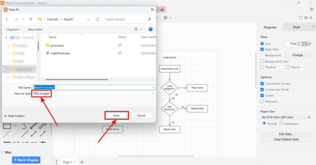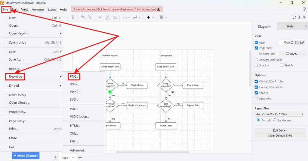 To export your diagram as a PNG in draw.io, follow these steps: