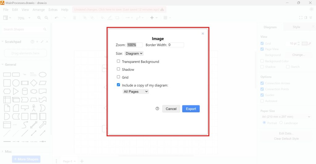 Exporting diagrams as PNGs in draw.io is straightforward yet versatile. Whether you need a quick export or advanced customization, draw.io has you covered. With features like transparent backgrounds and adjustable dimensions, you can ensure your diagrams look perfect for any use case. Give it a try – it might just become your favorite diagramming tool.