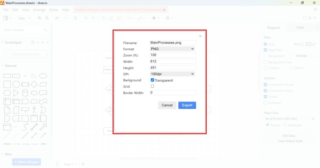 Imagine this scenario: You’re preparing a presentation for stakeholders and need to include a diagram. However, the presentation software only supports image uploads. Using draw.io, you can quickly export your diagram as a PNG with transparent backgrounds, ensuring it blends seamlessly with your slide design. You can also adjust the DPI for a high-quality print version if required. This flexibility saves time and enhances professionalism.