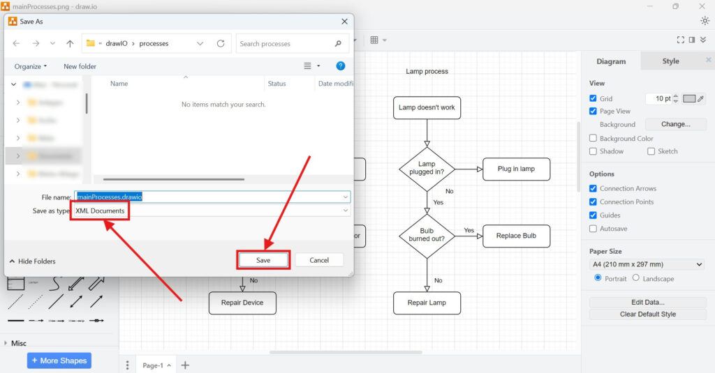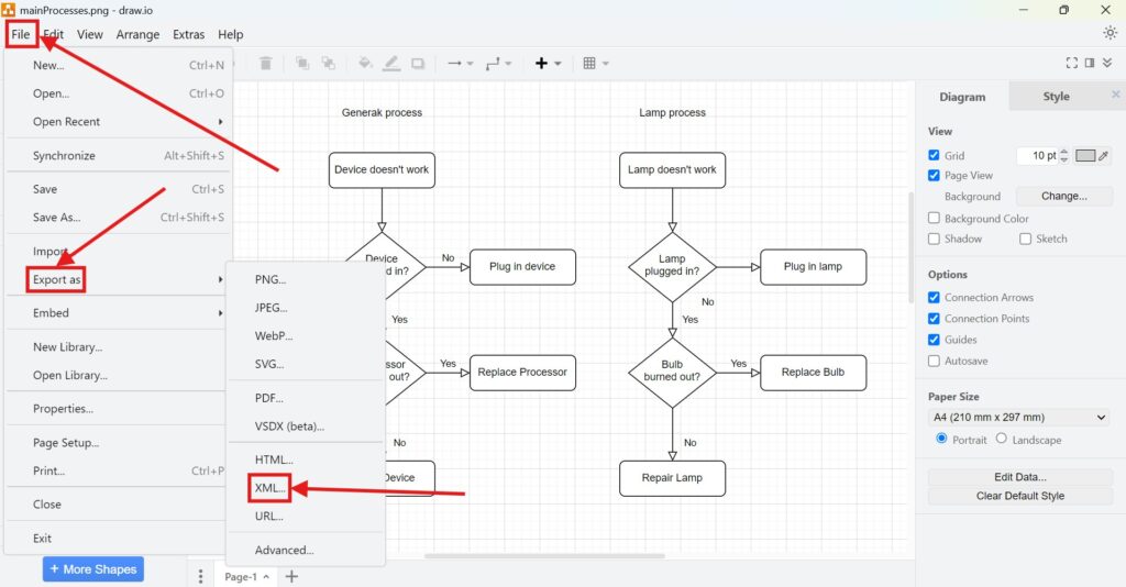 Exporting a diagram to XML in draw.io is simple. Follow these steps:
