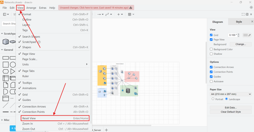 Sometimes, I zoom in too much or move my canvas too far. Everything seems out of place. When that happens, I reset the view in draw.io. Here is how: