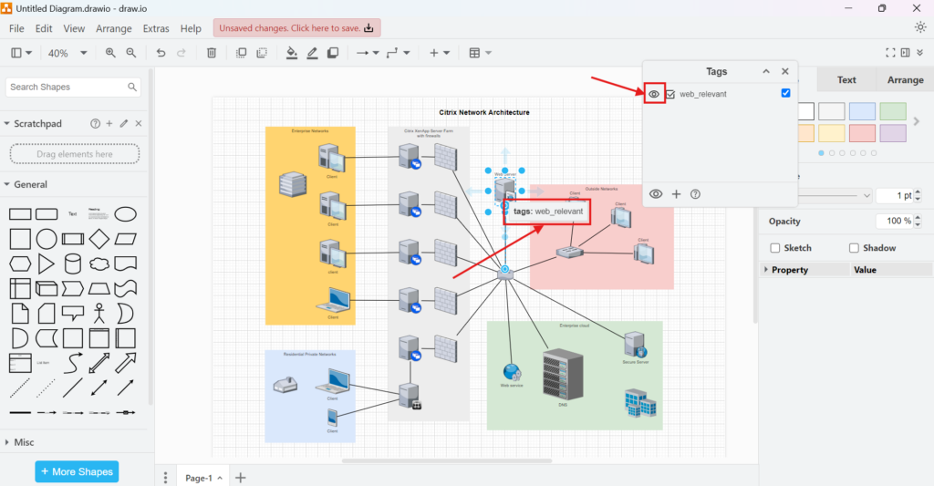 Controlling Tag Visibility. draw.io provides an easy way to control the visibility of tagged elements. Using the eye symbol in the tag window, I can choose whether to display or hide specific tags.