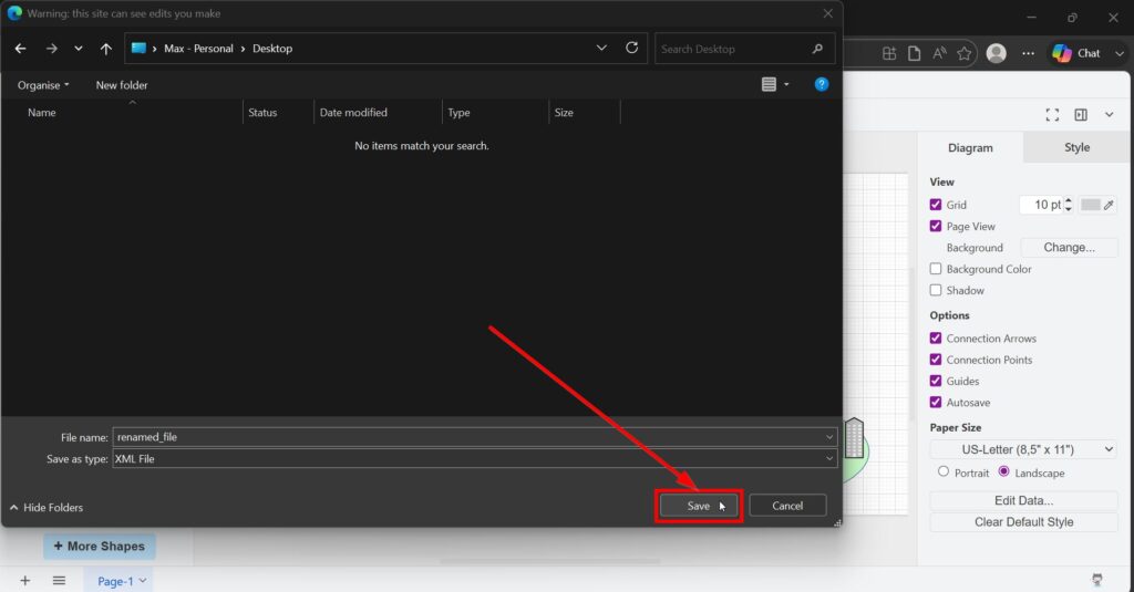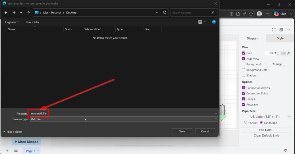 Finally, I click Save in the dialog. Then draw.io updates the file name. As a result, I see the new name in my storage location and in the editor context.