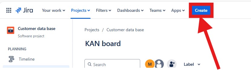 On the top navigation bar, you will find a “Create” button. Click on it to open the issue creation dialog.