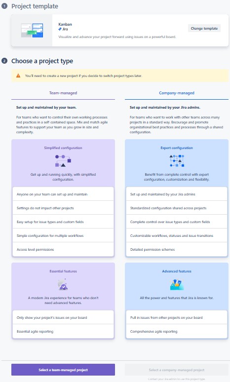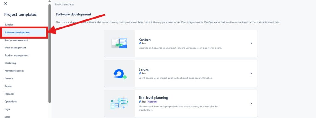 Select the template that best matches your project requirements. I choose the “Software development” template. In the “Software development” template I can choose between other templates. For instance, if you’re working with an agile development team, you might choose the Scrum or Kanban template.