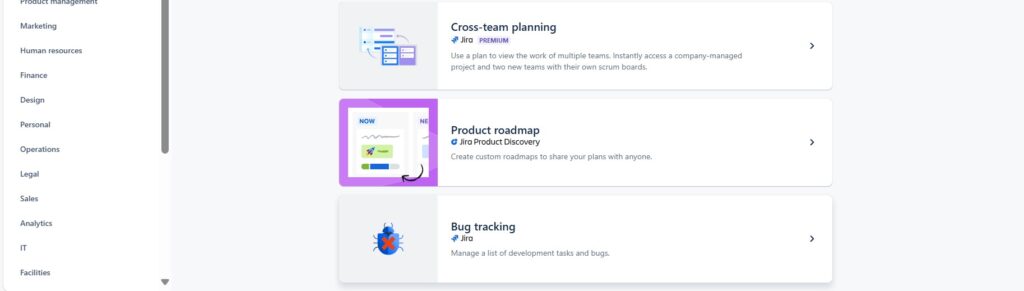 Jira offers several project templates designed to fit different types of projects. The most common templates include: