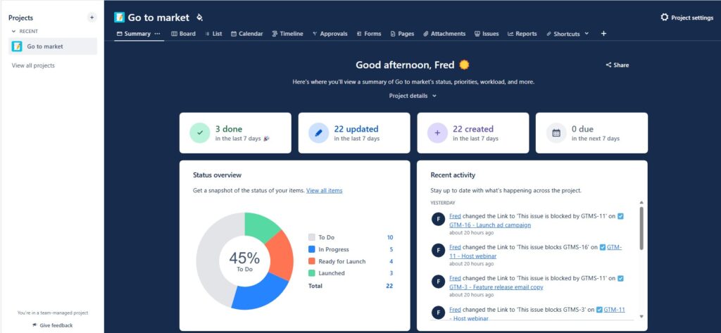 The project dashboard provides an overview of your project’s status, including active sprints, tasks, and recent activities. This centralized hub allows you to monitor progress and make informed decisions.