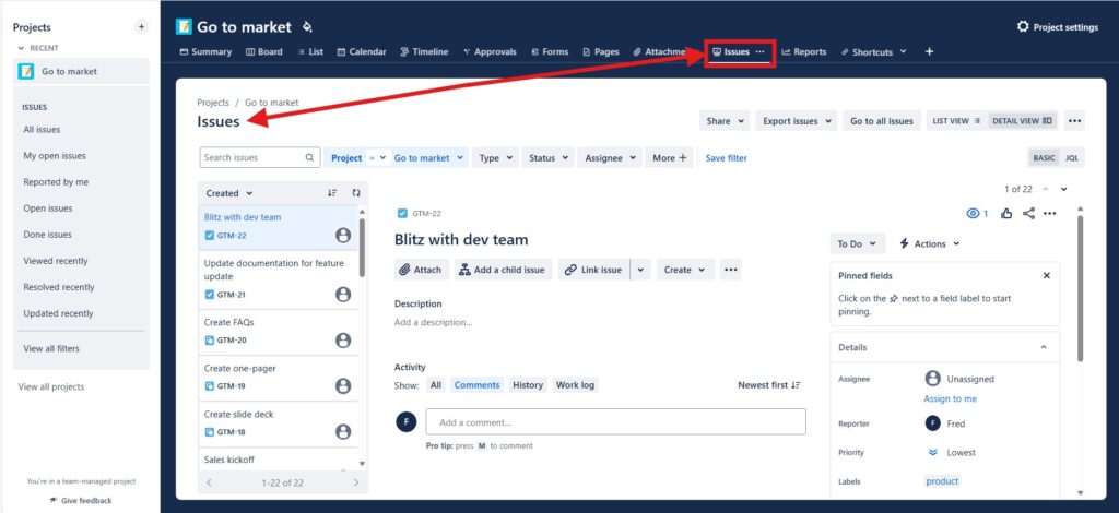 Jira Projects offers a range of reporting and analytics tools that provide insights into your project’s performance. Generate reports on issues, sprint velocity, the burndown chart, and more to keep your team on track and identify areas for improvement.