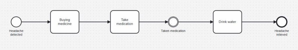 Consider a practical example: taking medicine for a headache. First, the process begins because someone experiences a headache. Next, they must purchase medication, then take the medicine, and finally drink water. At the end, the headache disappears. Clearly, this example highlights all three BPMN core elements. In BPMN this process would look like this.