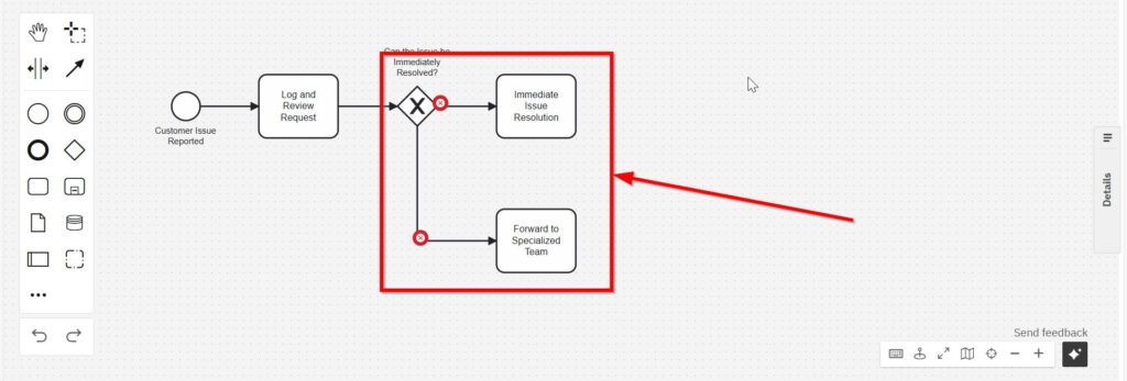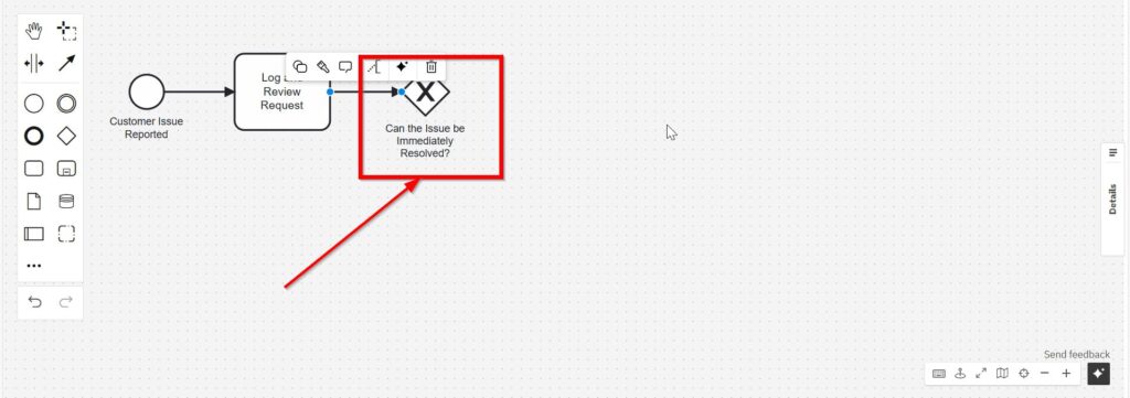 Afterwards, add an “Exclusive Gateway.” Label it explicitly: “Can the Issue be Immediately Resolved?”