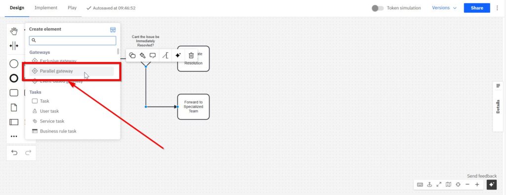 Now, introduce a “Parallel Gateway” after the specialized team task.