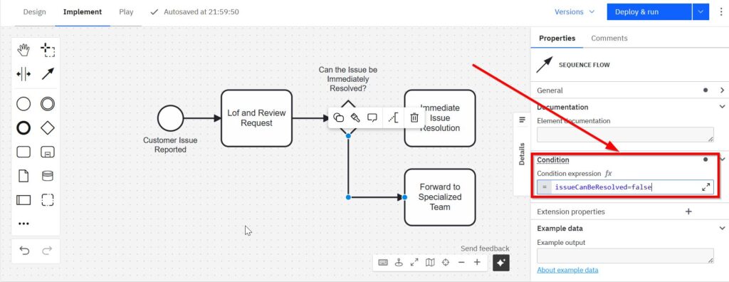For the lower path, I enter: “issueCanBeResolved=false”.