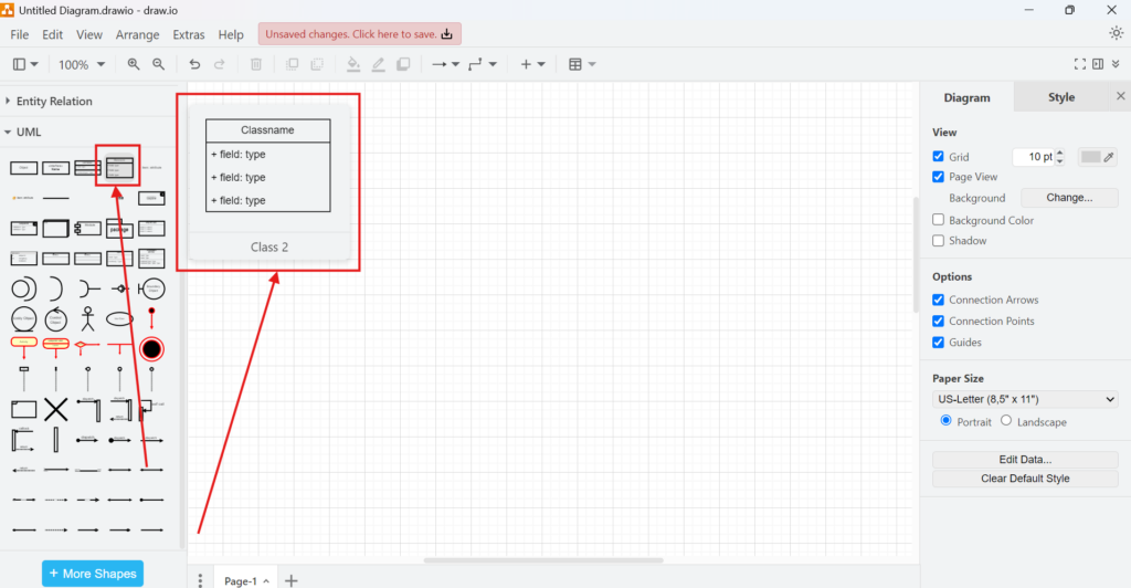 2. Step: Find the “Class 2” element. Click on it, and the class shape will appear on your canvas. This template is perfect for modeling UML class attributes in draw.io.