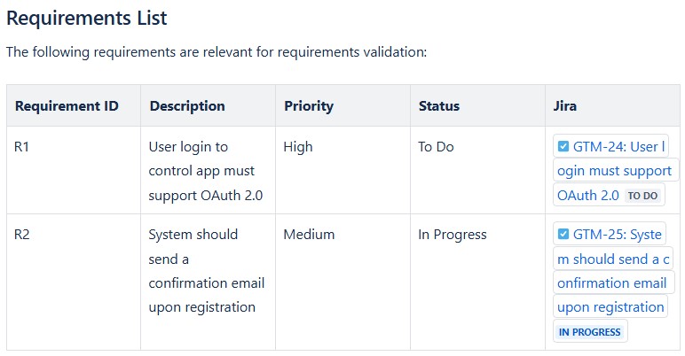 Each requirement listed in your Confluence page should be linked to a corresponding Jira issue. This ensures that any changes or updates in Jira are reflected in Confluence, and vice versa.